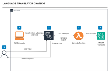 Developed a conversational AI bot that processes user inputs, detects intent and language, translates text using AWS Translate, and returns results instantly via Lex.