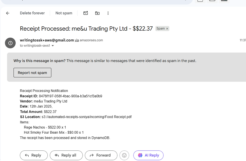 Verified sender/recipient identities in Amazon SES, set sandbox-mode emails, and defined notification content (vendor, date, total, S3 link). Established a reliable channel for post-processing confirmations and escalation.
