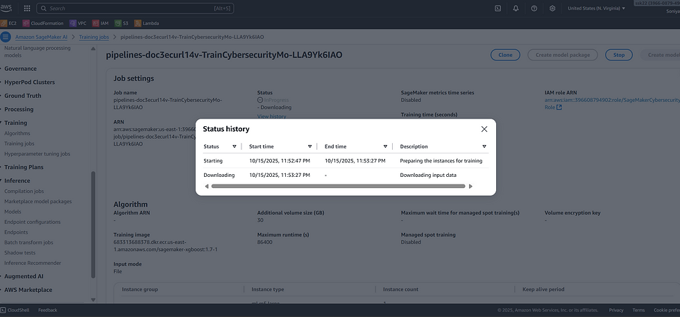 Provisioned roles/notebook, staged public UNSW-NB15 data in S3, engineered features, trained/evaluated XGBoost, deployed an HTTPS endpoint, then automated retraining/deployment via SageMaker Pipelines and (optional) EventBridge.