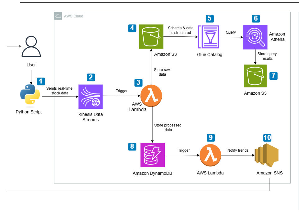 Provisioned Kinesis, streamed live quotes, processed with Lambda to S3/DynamoDB, cataloged data with Glue, queried via Athena, and emitted SMA-based trend alerts through SNS